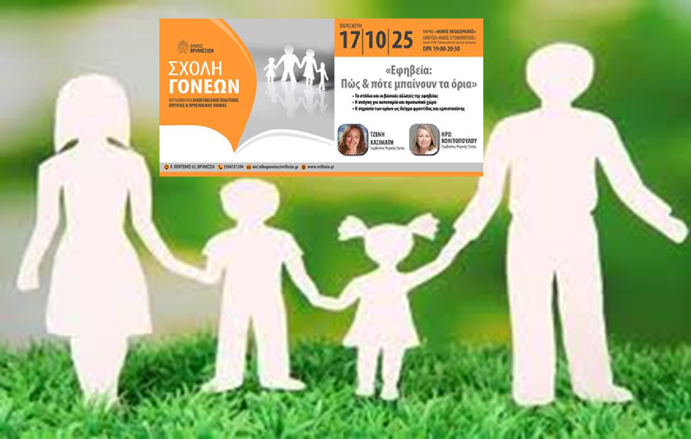 Αφιερωμένη στην εφηβεία και τα όρια είναι η συνάντηση της Σχολής Γονέων της Αντιδημαρχίας Οικογενειακής Πολιτικής Ισότητας και Προσχολικής Ηλικίας του Δήμου Βριλησσίων που θα πραγματοποιηθεί την Παρασκευή 17/10/2025 στις 19:00 στην αίθουσα «Νίκος Εγγονόπουλος» στο πάρκο Μίκης Θεοδωράκης (πρ. ΤΥΠΕΤ) Π. Μπακογιάννη 38-42.