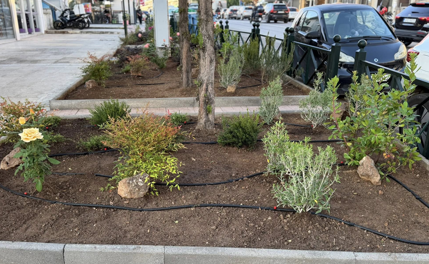 Το έργο περιλαμβάνει προσεγμένο αυτόματο πότισμα και μια αισθητική που αναδεικνύει τον χώρο.