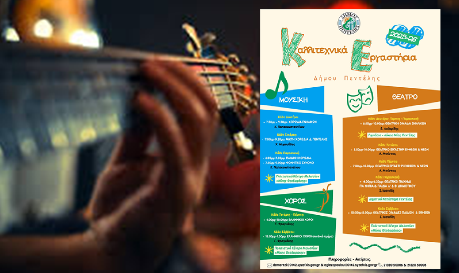 Ο Δήμος Πεντέλης ανοίγει και φέτος τις πόρτες της δημιουργίας μέσα απο  τα Καλλιτεχνικά Εργαστήρια του Μουσική, Θέατρο και Χορός για όλες τις ηλικίες προσφέροντας στους δημότες του μια μοναδική ευκαιρία να εκφραστούν, να μάθουν, να δημιουργήσουν  και να περάσουν  όμορφα μέσα από την Τέχνη.