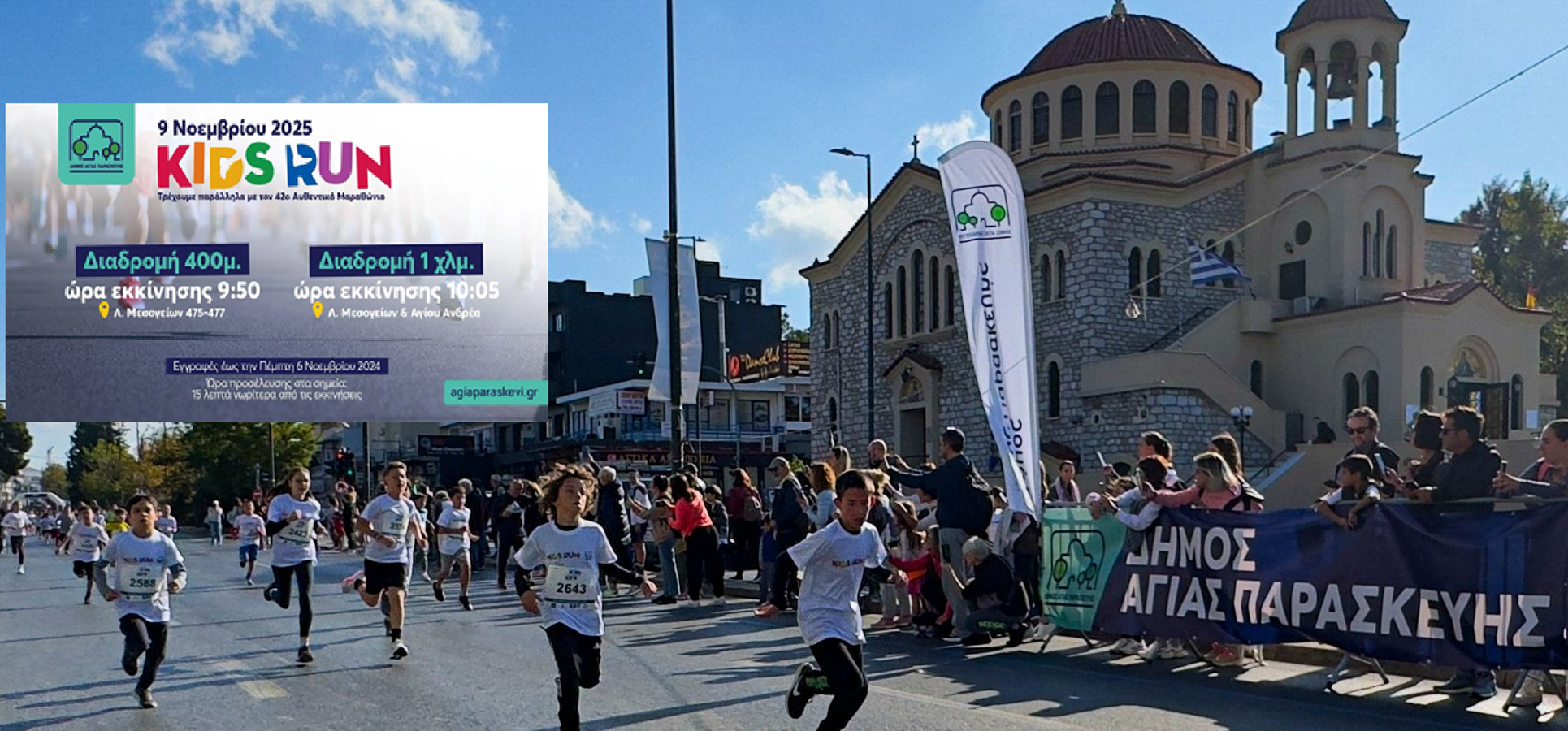 Με αφορμή την πραγματοποίηση του 42ου Αυθεντικού Μαραθωνίου της Αθήνας, που διοργανώνει ο ΣΕΓΑΣ με τη στήριξη της Περιφέρειας Αττικής το διήμερο 8-9 Νοεμβρίου, ο Δήμος Αγίας Παρασκευής διοργανώνει, την Κυριακή 9 Νοεμβρίου 2025, τον δικό του Αγώνα Δρόμου Μικρών Παιδιών στην αυθεντική μαραθώνια διαδρομή, στο ρεύμα καθόδου της Λεωφόρου Μεσογείων με κατεύθυνση το Κέντρο της Αθήνας.