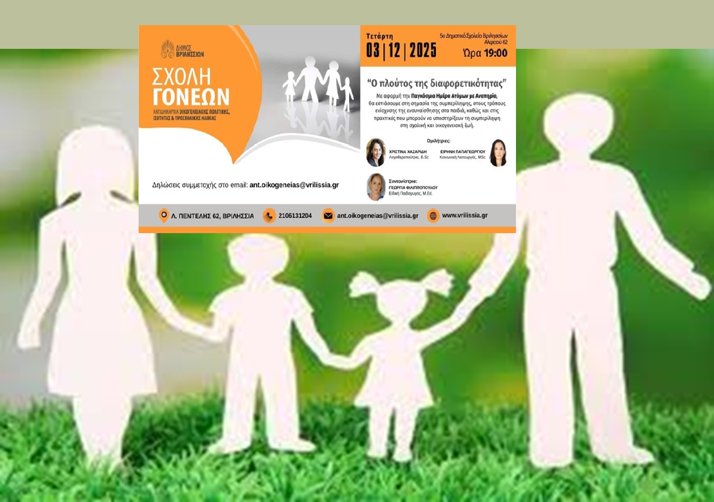 Αφιερωμένη στον «πλούτο της διαφορετικότητας» είναι η προσεχής συνάντηση της Σχολής Γονέων του Δήμου Βριλησσίων που θα πραγματοποιηθεί την Τετάρτη 03/12/2025 και ώρα 19:00 στο 5ο Δημοτικό Σχολείο Βριλησσίων (Αλφειού 62).