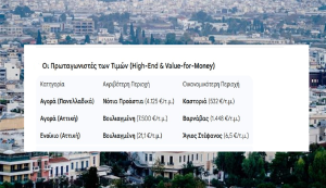 Στις κορυφαίες τιμές πώλησης πανελλαδικά βρίσκονται τα Νότια Προάστια μετά ακολουθούν οι Κυκλάδες, τα Βόρεια Προάστια, η Λευκάδα και τα Χανιά.