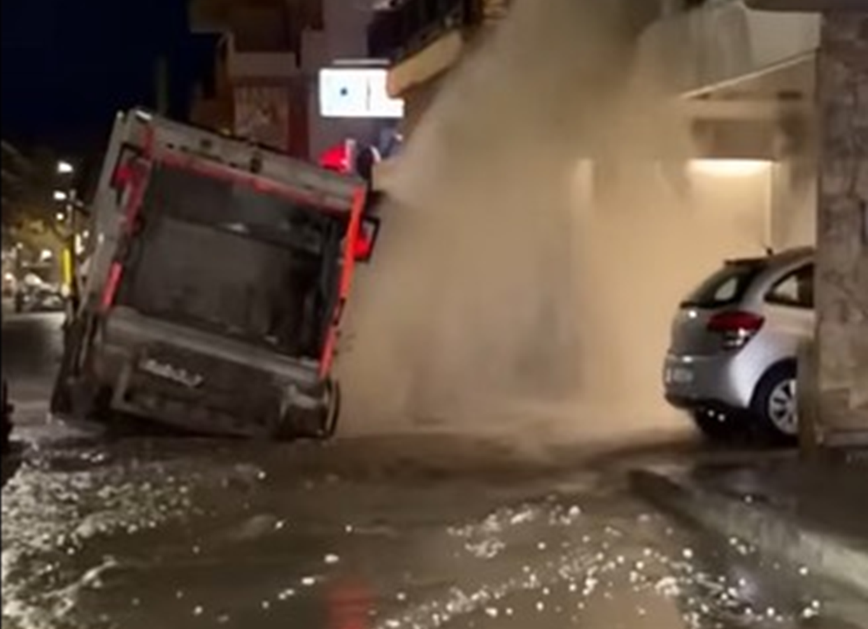 Σοβαρή καθίζηση οδοστρώματος στην Ξάνθη: Απορριμματοφόρο «βυθίστηκε» στην οδό Ανδρέου Δημητρίου